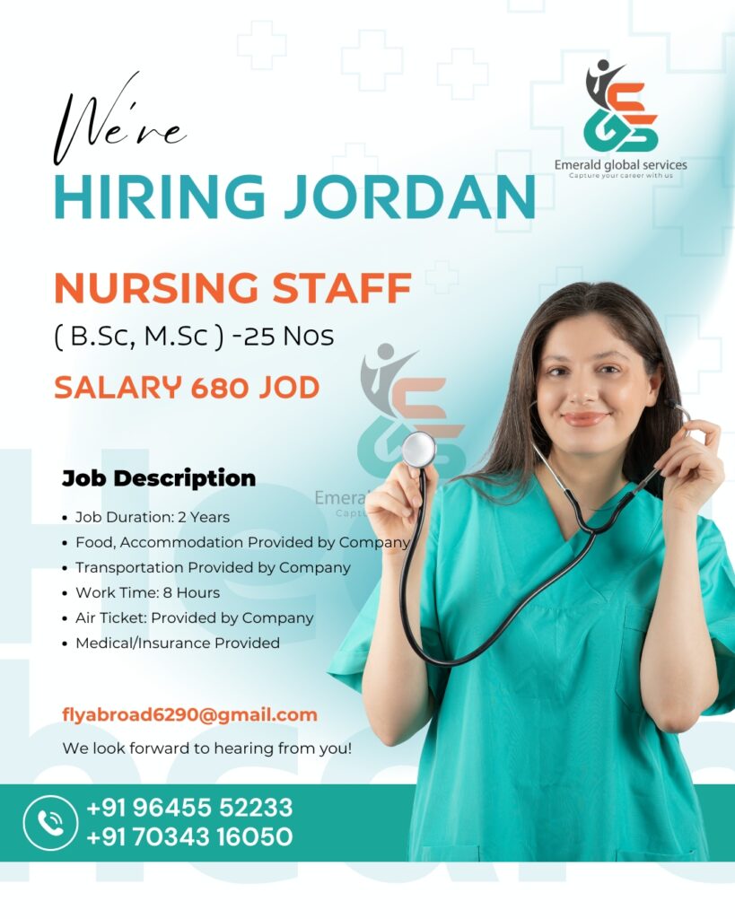 MALE & FEMALE BSC , MSC SALARY 680 JOD Job Description Job duration 2 year Food ,Accommodation provided Transportation provided Work time 8 hour Air Ticket provided Medical / Insurance provided